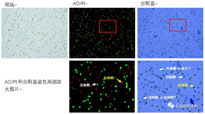 结论:运输前细胞状态好,台盼蓝与AO/PI计数结果无明显差异;运输后的细胞样本,台盼蓝计数结果与运输前无明显差异,但是AOPI计数结果明显低于台盼蓝计数;从图4中也可以明显观察到,运输后的样本中,台盼蓝染色的图片中有些细胞被台盼蓝染色非常浅,肉眼判断死活非常困难。