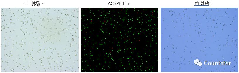 2、复苏后的样本中,一些状态不好的细胞台盼蓝染色可能不太清晰,台盼蓝染色特异性不太好,计数结果可能会带来较大的误差,使用AO/PI双荧光法计数,死、活细胞区分更加清晰,可以得到更加精确的结果;但是两种方法计数活率差异程度也会依赖于冻存方法和冻存前的细胞状态等。