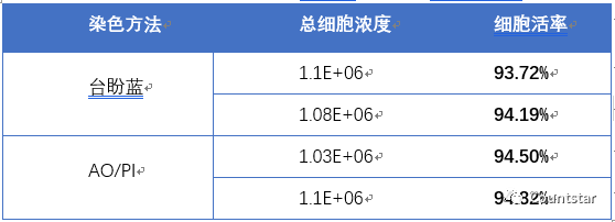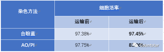 1、上述实验结果证明,细胞状态好的样本,用台盼蓝计数与AO/PI两种方法计数得到的细胞活率结果一致;