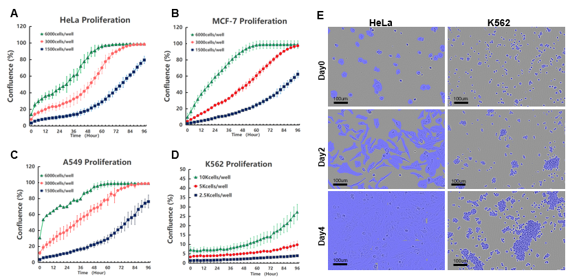 图 1. Hela (A), MCF-7 (B), A549 (C), K562 (D) 在不同接种密度下的增殖曲线。(E) 接种密度为每孔 3000 个细胞的 Hela 和每孔 10K 个细胞的 K562 在第0天、第2天和第4天的增强明场(BF)识别图像。