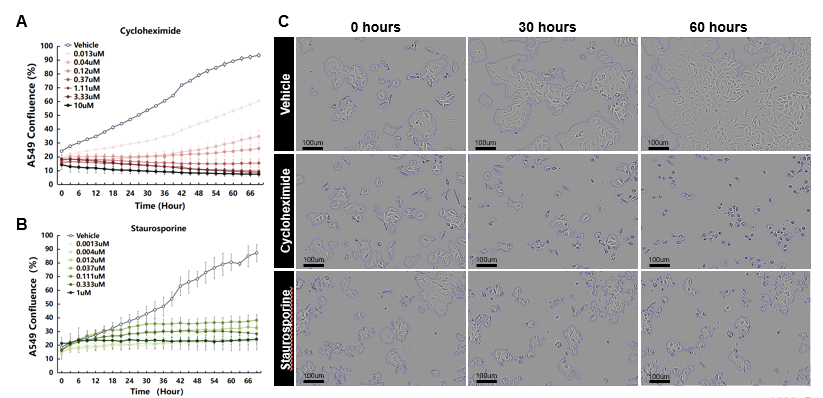 图 2. A549 细胞在环己酰亚胺 (A) 和十字孢碱 (B) 作用下的汇合度变化图表,以及暴露于 10µM 环己酰亚胺和 1µM 十字孢碱的 A549 细胞代表性图像 (C)。